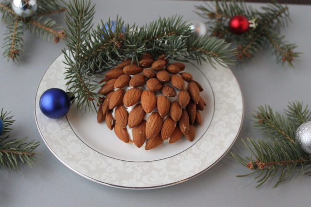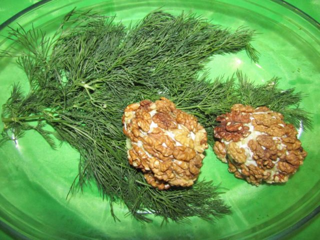 - Cubra con una mezcla de mayonesa y queso, pegue suavemente las nueces, comenzando por una punta fina.
