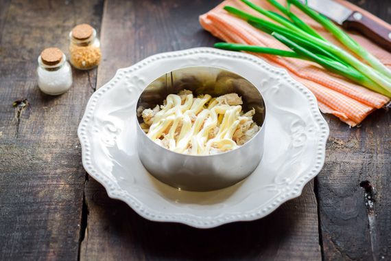 - Extienda en capas, cubra con mayonesa y espolvoree con sal. Primero, carne, luego nueces, huevos, virutas de queso.