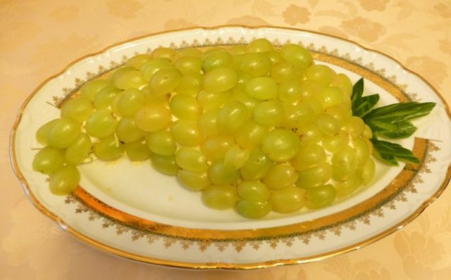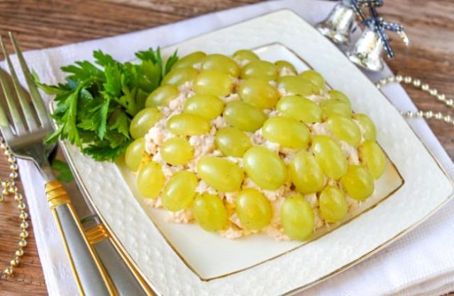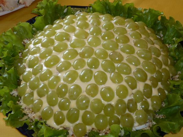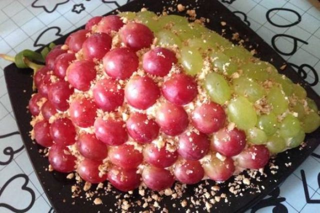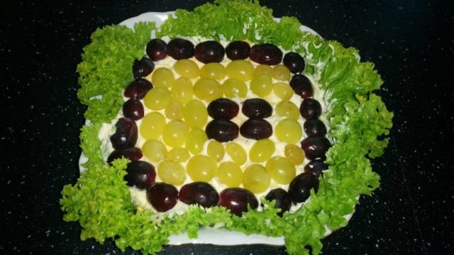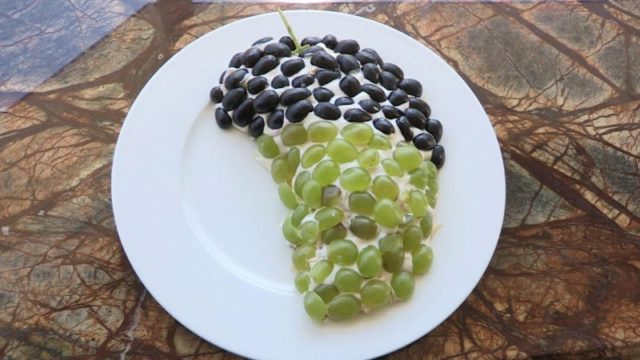 Todos los productos preparados se colocan en capas, empapados en mayonesa. Decora la ensalada Tiffany con uvas. El color no importa. Cada fruta se corta por la mitad y se deben quitar las semillas.