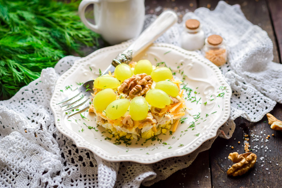 La ensalada Tiffany con uvas es un plato exquisito que ocupará el lugar que le corresponde en cualquier festividad. Si lo desea, puede agregar sus especias y hierbas favoritas a la composición. Se recomienda servir frío.