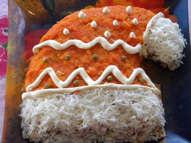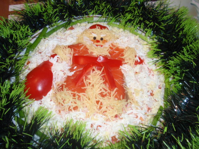 La ensalada de cangrejo se puede encontrar en casi todos los festines, y la oportunidad de probar un aperitivo en forma de Papá Noel es un éxito excepcional. Los niños están especialmente felices con ella.