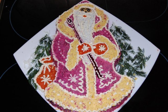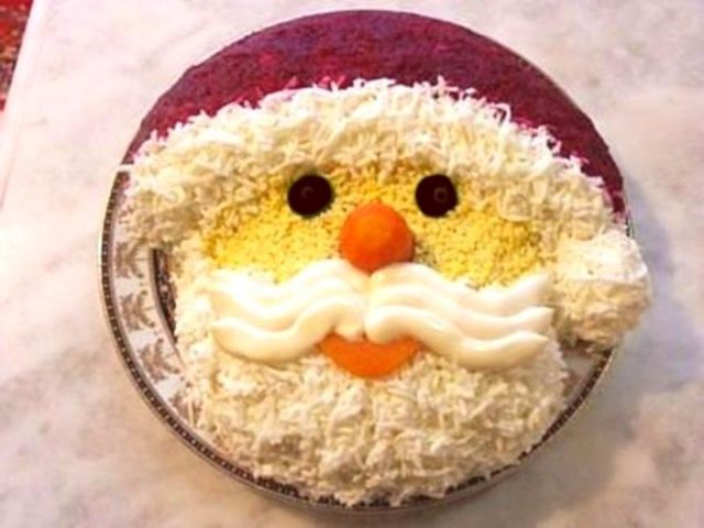 Independientemente de las ensaladas que se sirvan para la fiesta de Año Nuevo, es imposible imaginarlo sin arenque debajo de un abrigo de piel. Puedes prepararlo según la receta original, en forma de Papá Noel. Esto requiere: