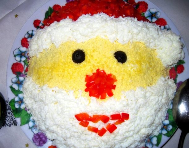 La composición es diferente, por ejemplo, puedes preparar una ensalada de Papá Noel con camarones, pollo, palitos de cangrejo, pescado, verduras. Los productos para decoración también pueden seleccionarse a su gusto. Lo principal es su compatibilidad y color. Por ejemplo, los tomates son un digno sustituto de la pimienta.