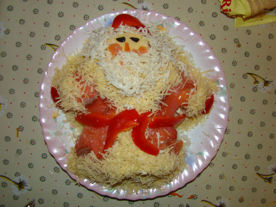 - En una fuente ancha, comience a decorar la ensalada: corte un medio óvalo de un trozo de queso, esta será la cara de Papá Noel. Espolvoree las mejillas con pimentón, haga ojos con granos de pimienta negra, bigote y barba con proteína rallada.