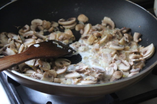 - Agregue los champiñones en rodajas. Rocíe con crema. Cocine a fuego lento durante 7 minutos.
