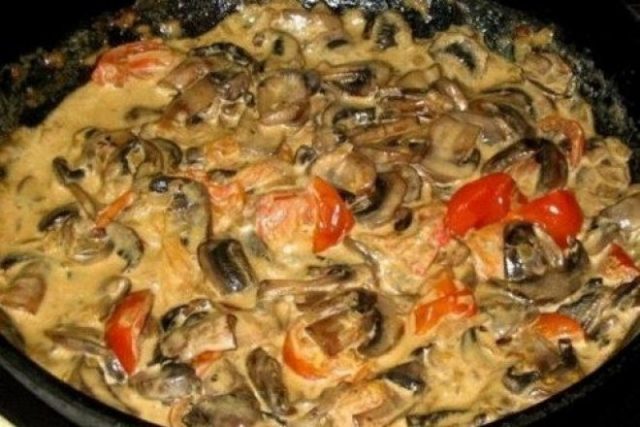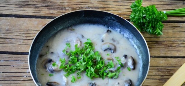 Los champiñones en salsa cremosa se preparan durante todo el año gracias a su escala de producción. No solo los champiñones frescos son adecuados para el plato, sino también los congelados.