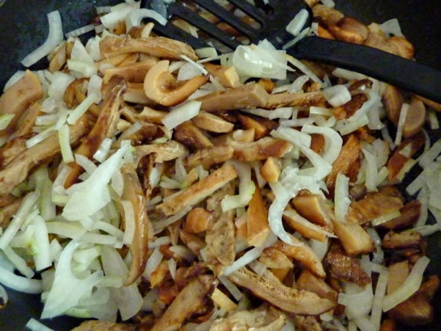- Cortar las setas de leche en rodajas pequeñas y agregarlas a la cebolla, luego freír durante 4 minutos.