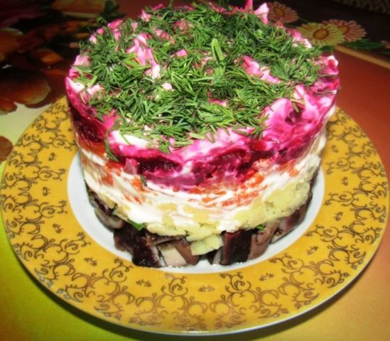 Se recomienda dejar la ensalada en el frigorífico durante varias horas para que las capas se empapen en la salsa. La ensalada en capas con podgruzdki blanco es especialmente relevante para la mesa festiva.
