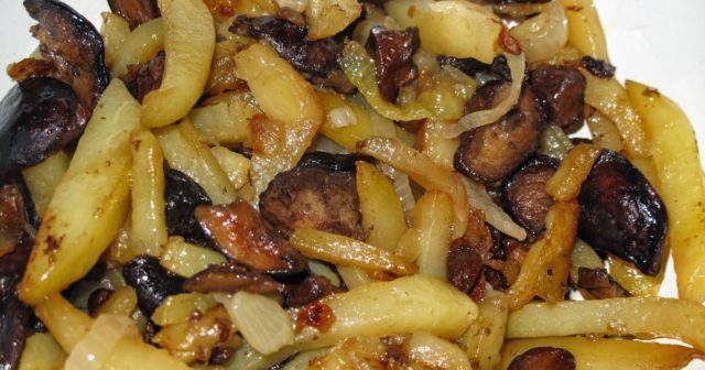 - Pelar las patatas, cortarlas en tiritas y sazonar con sal. En unos minutos, envíelo a las setas.