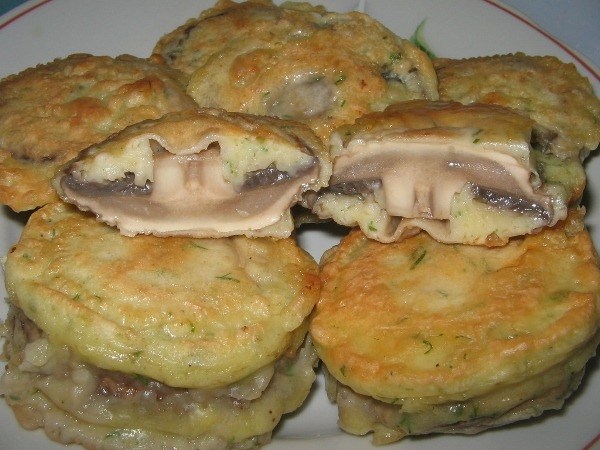 - Hacer una masa con 2 huevos y harina. Sumerja los champiñones y fríalos por ambos lados en aceite vegetal.