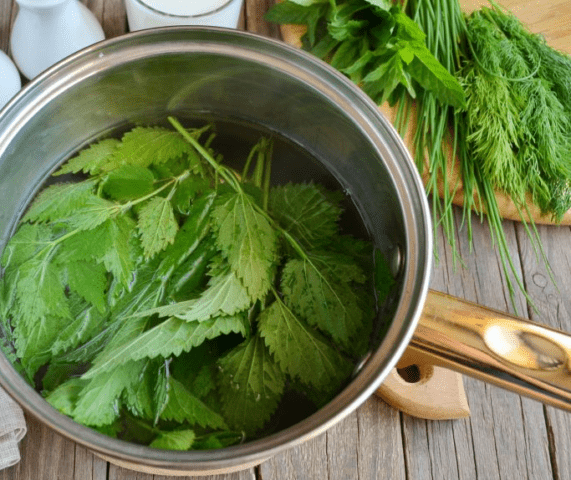 - Enjuague las ortigas y hierva en agua con sal durante 5 minutos, pique finamente.