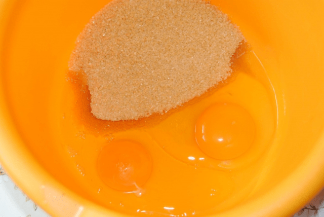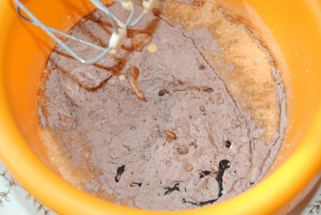 - Batir los huevos con azúcar morena. Es necesario obtener una espuma aireada. Mezcle la harina, el polvo de hornear y el cacao por separado.