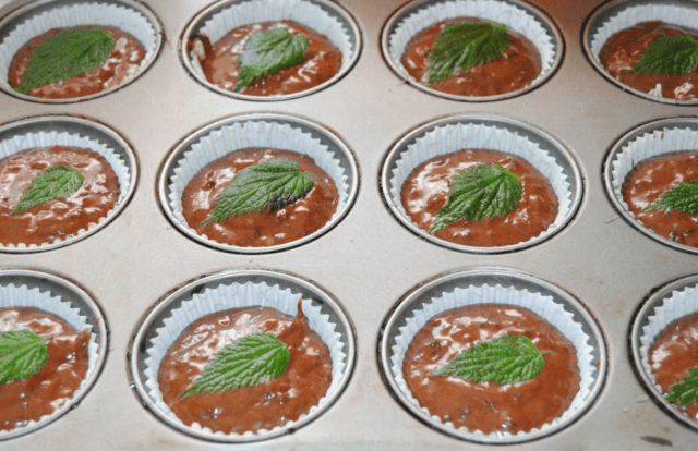 - Vierta 3/4 de la masa en moldes para muffins, decore con una hoja de ortiga con agua hervida. Hornee a 180 grados durante 25 minutos.