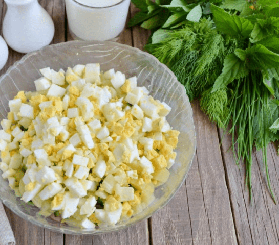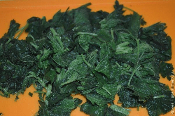 - Enjuague la ortiga, vierta agua hirviendo sobre ella, como siempre, para eliminar la tacañería. Cortar en trozos pequeños.