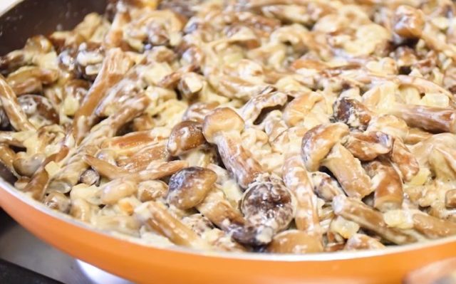 - Combine los hongos de miel con las cebollas, continúe friendo durante un tercio de hora, luego agregue sal, pimienta, mezcle y continúe friendo durante cinco minutos.