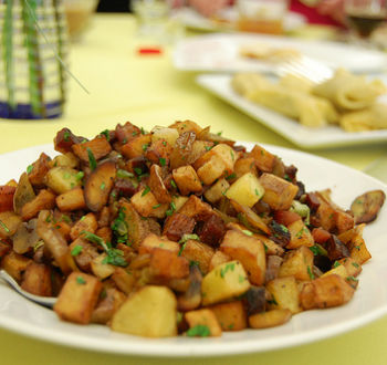 Cómo freír patatas en una sartén con champiñones, ajo y hierbas.