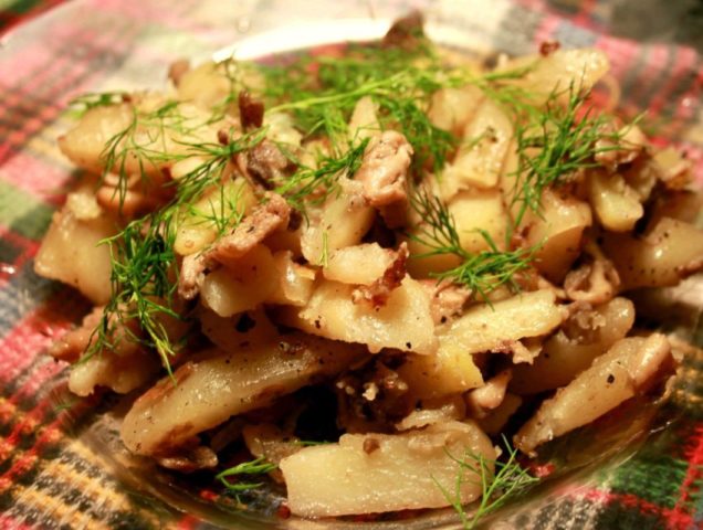 Los champiñones darán agua, las papas no se fríen, sino que se cocinan mal. Los cuerpos frutales necesitan 10 minutos hasta que estén cocidos, las papas necesitarán más tiempo hasta que tengan una corteza amarilla densa. El plato resultará poco estético, en forma de masa informe.