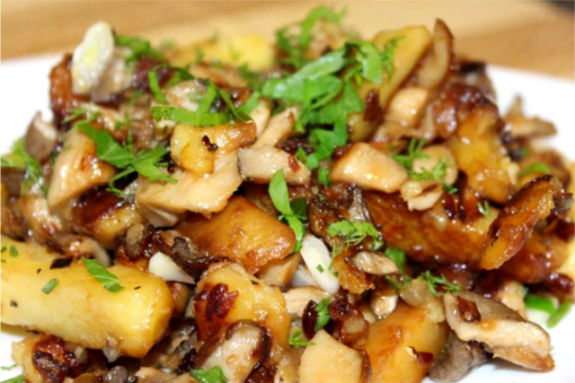 Puedes cocinar patatas con setas ostra fritas y verduras. Ingredientes de la receta: