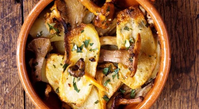 Los hombres suelen exigir comidas abundantes. Estarán encantados si la mujer que aman cocine patatas fritas con rebozuelos en una sartén con salsa.