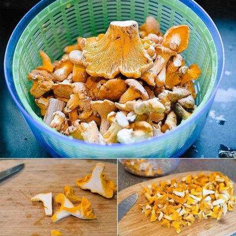 - Enjuague los rebozuelos después de remojarlos, corte los grandes.