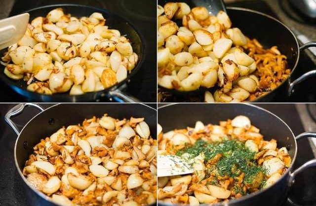 Cocine rebozuelos con patatas en una sartén, repitiendo todos los pasos: