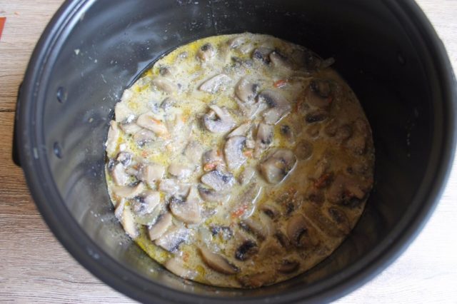 La receta de champiñones fritos con cebolla y crema agria en una olla de cocción lenta es ligeramente diferente en la tecnología de cocción.