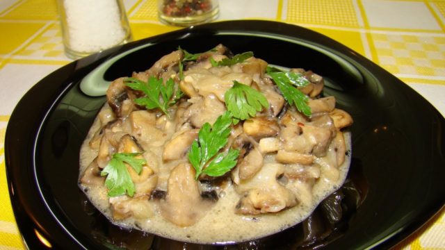 De acuerdo con esta receta, los champiñones en crema agria se pueden consumir como un plato independiente, servidos como refrigerio o con su guarnición favorita.