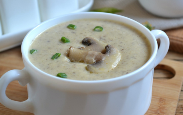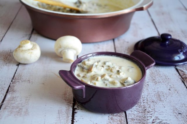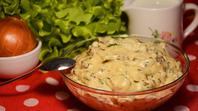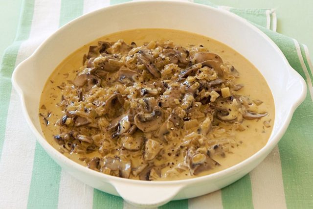 El delicado sabor de la salsa de champiñones con crema agria satura bien el cuerpo.