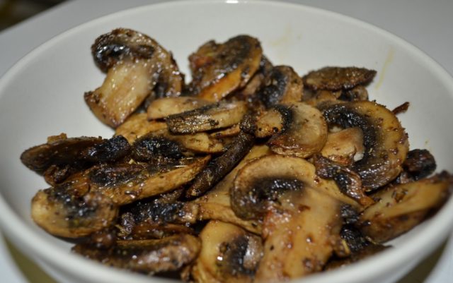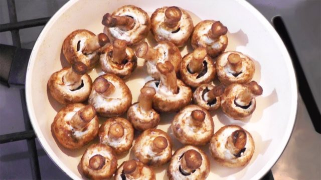 - Los cuerpos de las frutas se moldean en platos, se agrega la temperatura, las rodajas de champiñones se fríen durante 3 minutos por cada lado, se agrega sal durante la cocción.