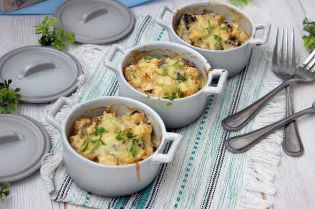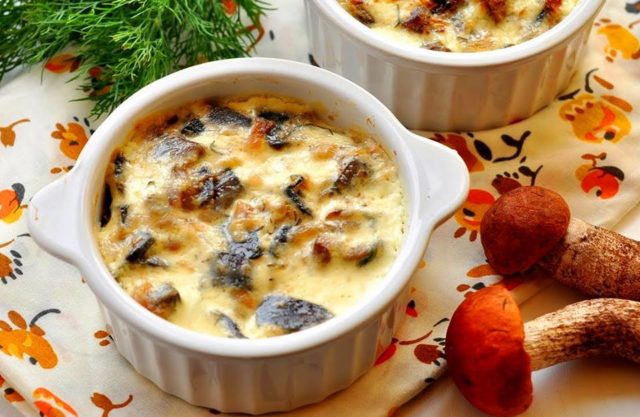 - Poner boletus con cebolla en cazuelas de cerámica, verter salsa de crema agria encima y espolvorear con queso.