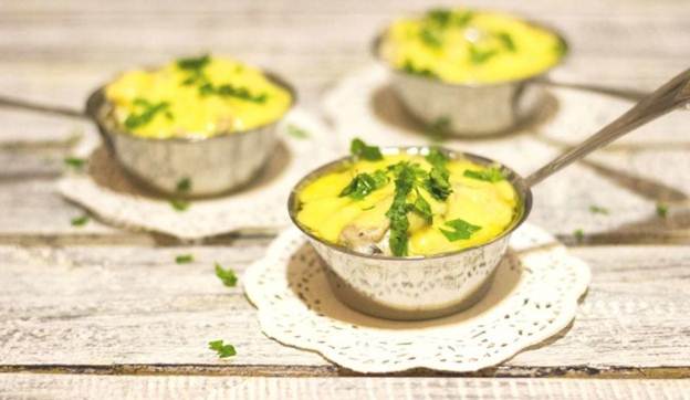 Cómo cocinar juliana con pollo y champiñones.