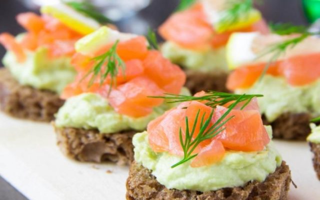 Sándwiches preparados con pescado rojo y pasta de aguacate decorarán la mesa durante la mesa del buffet. Los huéspedes estarán encantados de comerlos con vino blanco o champán.