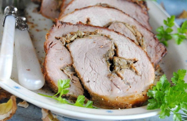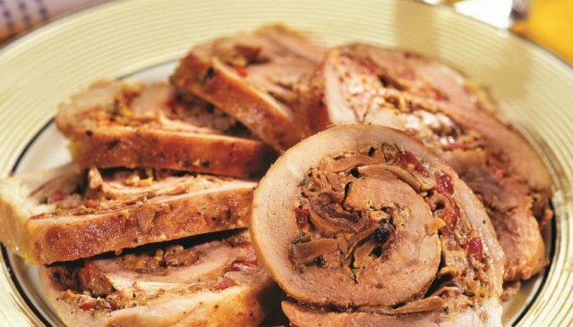 - Ponga el relleno en cada rebanada de cerdo, enróllelo, fíjelo con palillos de dientes.