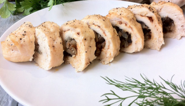Si agrega verduras, zanahorias, pimientos, ciruelas pasas al relleno de champiñones, el plato se verá muy hermoso en el corte.