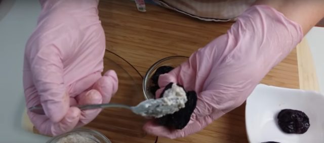 - Las ciruelas pasas se abren en 2 partes, se coloca 1 cucharadita en el interior. mezcla de nueces preparada.