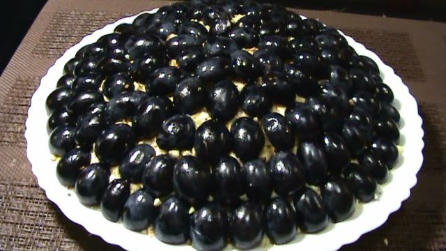 Una versión interesante de la receta, en la que las uvas oscuras sirven como decoración para las perlas negras.