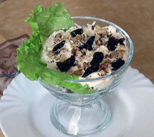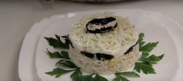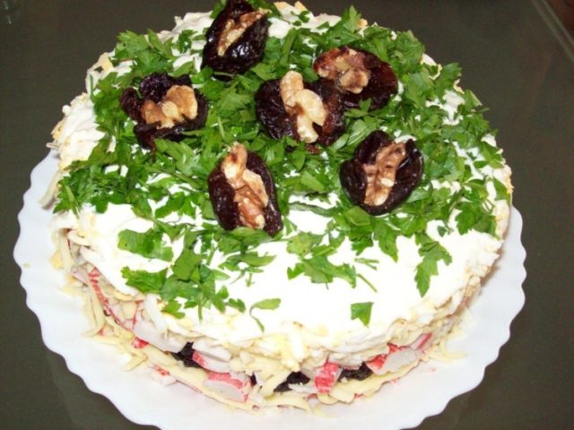 Ensalada de perlas negras con palitos de cangrejo y ciruelas pasas