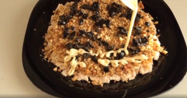 Todos los componentes están triturados. Los frutos secos se rellenan con nueces enteras. Cada capa de la pieza de trabajo se cierra con mayonesa y comienza.