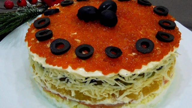 Todos los productos se cortan en trozos pequeños y la ensalada comienza a recolectarse, cada capa se cubre con mayonesa. El caviar se divide en 2 partes. Secuencia de marcadores de capa: