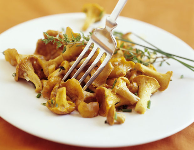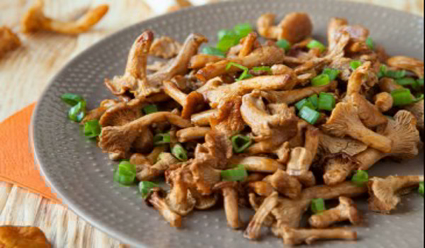 Los rebozuelos en escabeche o simplemente hervidos se colocan en un recipiente, el contenido ya enfriado de una sartén, se agregan almendras y se sazonan con la salsa resultante. Espolvorea con cebollas verdes picadas.