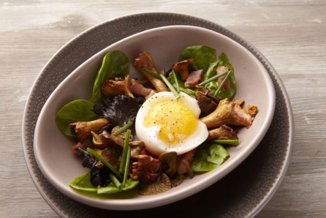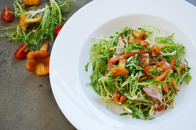 Ensalada de setas con rebozuelos y cordero