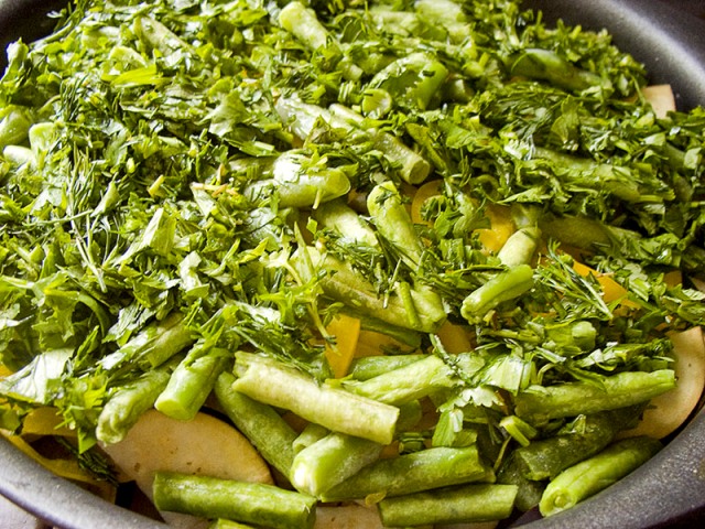 - cebollas verdes y eneldo;