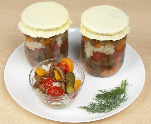 - A continuación, las verduras y los champiñones preparados se colocan en capas en frascos, se vierten con almíbar caliente y se esterilizan durante 15 minutos.